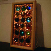 Light Painting is a small copper canvas of light intended to offer an individualization of ones space. An individuals aesthetic is emphasized by the ability to customize the light pattern. Conceived as an interactive Tiffany Lamp, the painting is made of beautifully colored glass disks that, once touched, illuminates a light behind it. Small and contained, simple switches are concealed between the copper and the glass. View Prototype: click on circles to simulate the interaction Shockwave required.